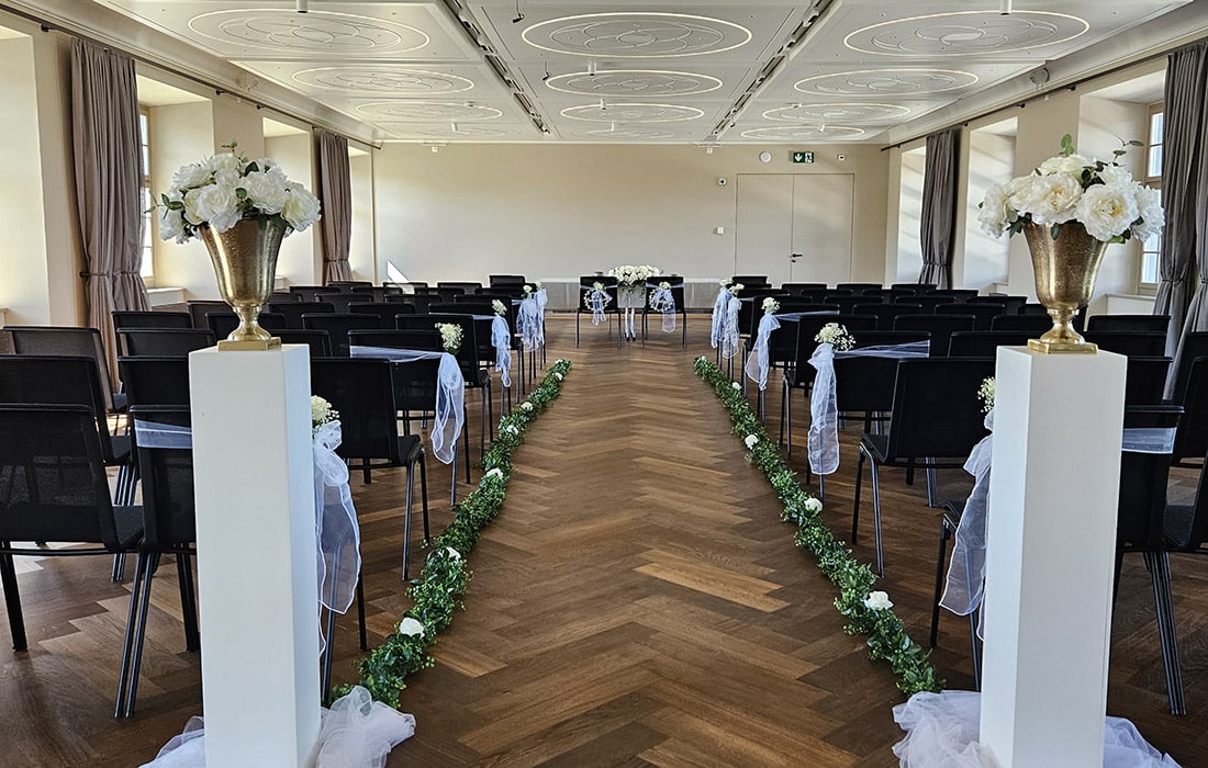 Vereinbaren Sie mit uns einen Besichtigungstermin und überzeugen Sie sich selbst von der modernen und stilvollen Einrichtung unseres Traulokals, die sich wunderbar in das historische Umfeld einfügt. Ein Ort, an dem sich Geschichte, Gegenwart und Zukunft die Hand reichen.